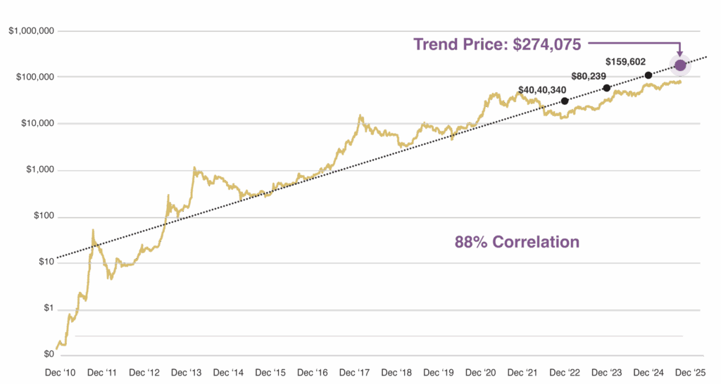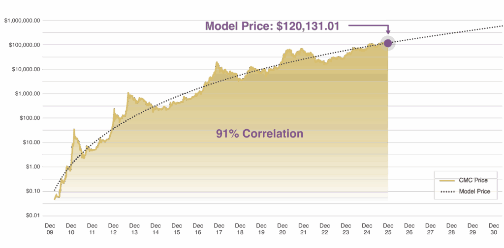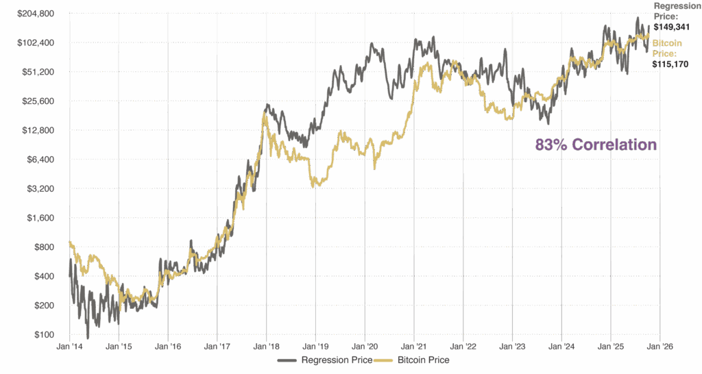 Source: BTC_POWER_LAW / PlanG, Model Equation: Y=10-17*X5.83 Bitcoin Price Source: http://coinmarketcap.com. BTC Power Law is a theory on Bitcoin behavior which intends to prove that Bitcoin’s regularities show that it behaves more like a physical system than an asset. See “The Bitcoin Power Law Theory,” Giovanni Santostasi, Medium, March 20, 2024. The correlation presented in this chart is designed to illustrate the Power Law Theory model. It is not intended to illustrate performance. Past performance or correlations are not indicative of future performance or results. Data as of 10/13/25.