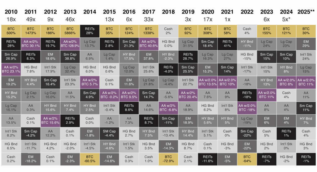 Source: novelinvestor.com, Off the Chain Capital. Data as of 10/9/25. *How many times greater Bitcoin has performed than the second best performing asset class. **Performance of assets since the end of 2024.