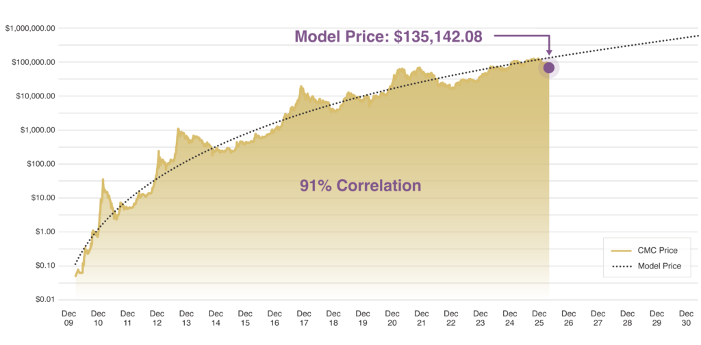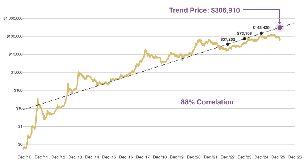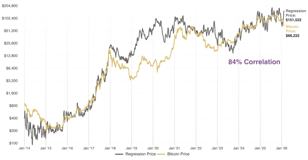 Source: BTC_POWER_LAW / PlanG, Model Equation: Y=10-17*X5.83 Bitcoin Price Source: http://coinmarketcap.com. BTC Power Law is a theory on Bitcoin behavior which intends to prove that Bitcoin’s regularities show that it behaves more like a physical system than an asset. See “The Bitcoin Power Law Theory,” Giovanni Santostasi, Medium, March 20, 2024. The correlation presented in this chart is designed to illustrate the Power Law Theory model. It is not intended to illustrate performance. Past performance or correlations are not indicative of future performance or results. Data as of 2/15/26.