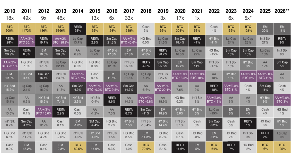 Source: novelinvestor.com, Off the Chain Capital. Data as of 2/12/26. *How many times greater Bitcoin has performed than the second best performing asset class. **Performance of assets since the end of 2025.