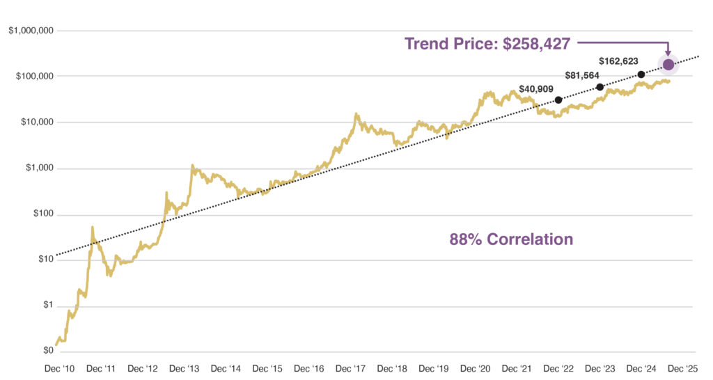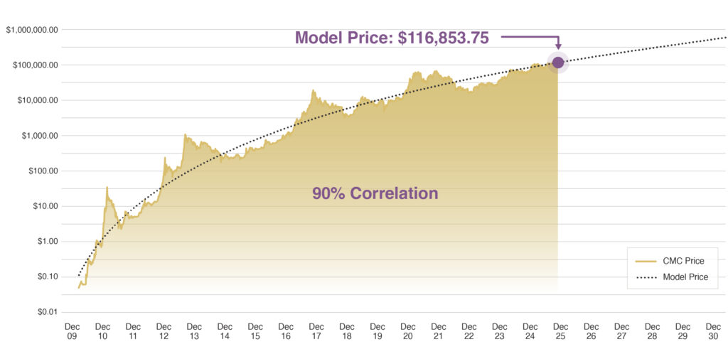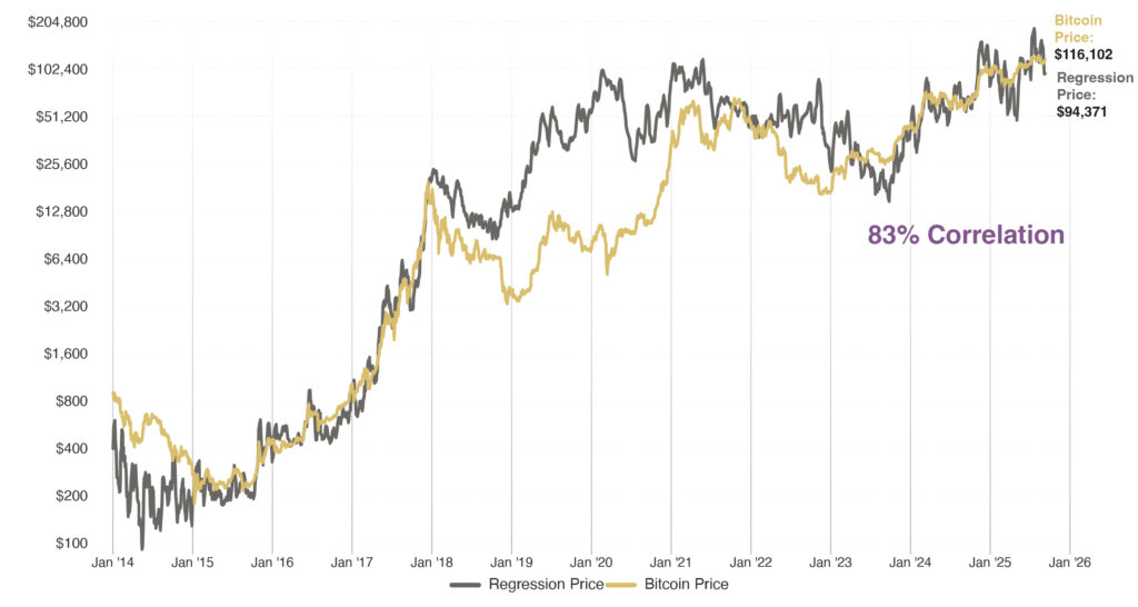 Source: BTC_POWER_LAW / PlanG, Model Equation: Y=10-17*X5.83 Bitcoin Price Source: http://coinmarketcap.com. BTC Power Law is a theory on Bitcoin behavior which intends to prove that Bitcoin’s regularities show that it behaves more like a physical system than an asset. See “The Bitcoin Power Law Theory,” Giovanni Santostasi, Medium, March 20, 2024. The correlation presented in this chart is designed to illustrate the Power Law Theory model. It is not intended to illustrate performance. Past performance or correlations are not indicative of future performance or results. Data as of 9/14/25.